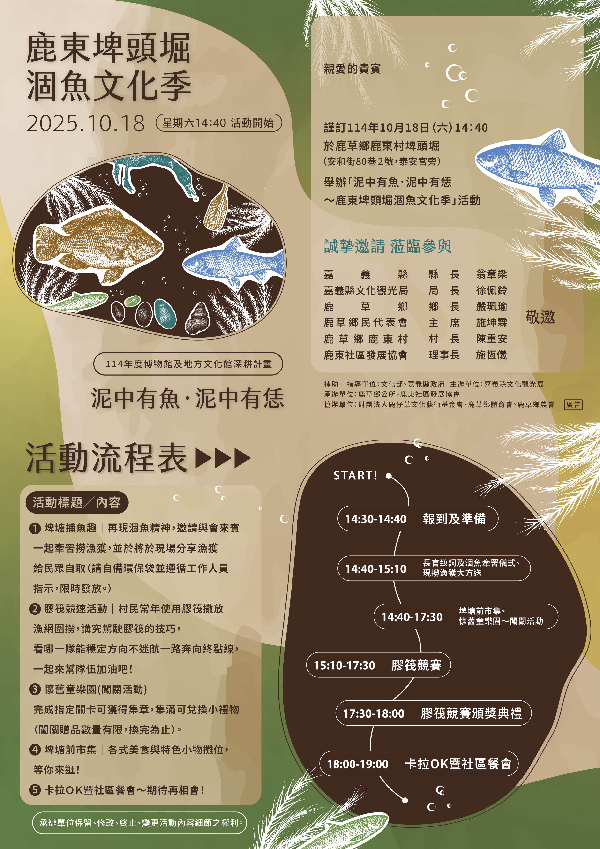 活動預計於114年10月18日(星期六)14時30分至19時於鹿草鄉鹿東社區埤頭堀辦理,活動內容包含埤塘捕魚趣、膠筏競速活動、懷舊童樂園(闖關活動)及園遊會,並有晚間卡啦ok暨社區餐會。 相關資訊請至FB搜尋【鹿草鄉立圖書館暨文化學堂】粉絲專頁,掌握最新消息。 相關說明文件(本區連結會開啟新視窗) 海報 活動流程表 場地配置圖